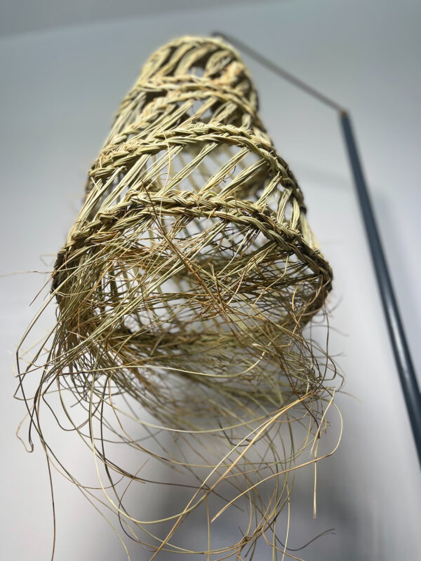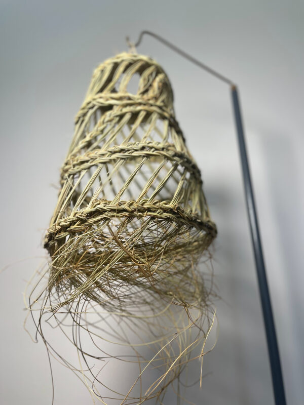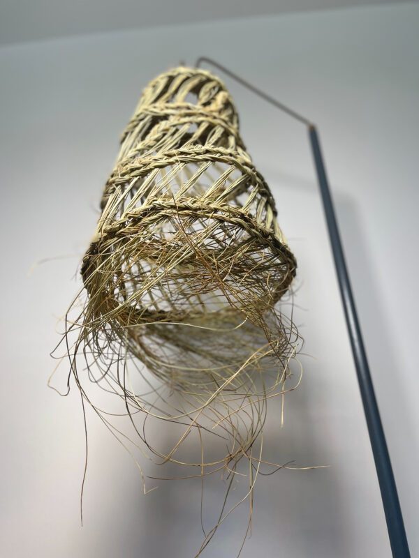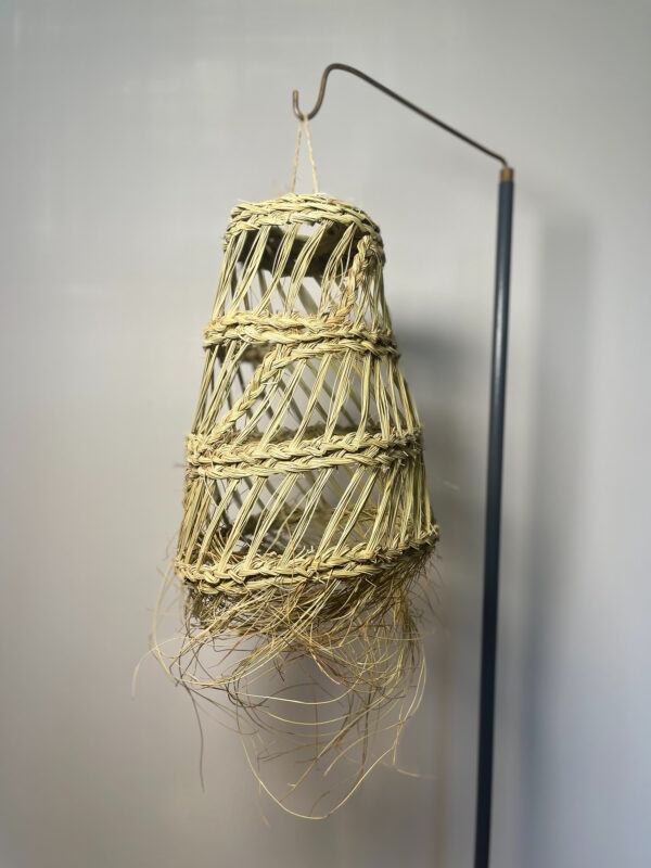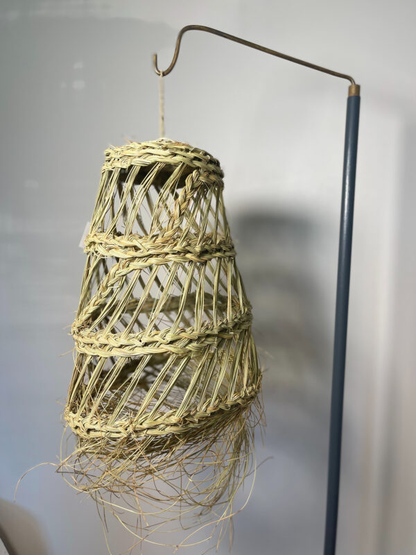 Suspension en fibres naturelles de palmier tressée de forme conique, fabriquée à la main dans une coopérative d’artisans au Maroc.