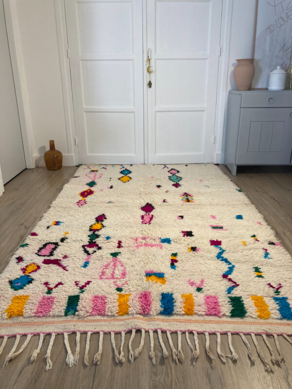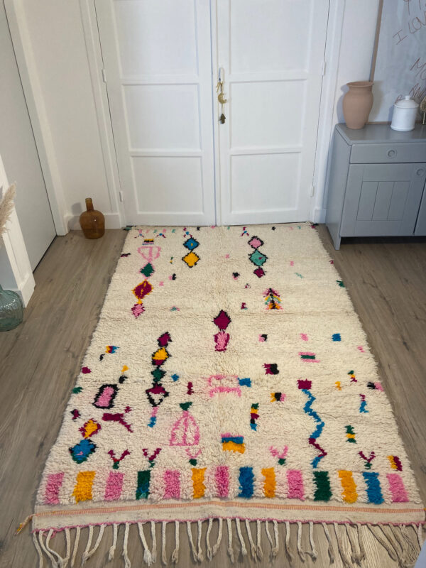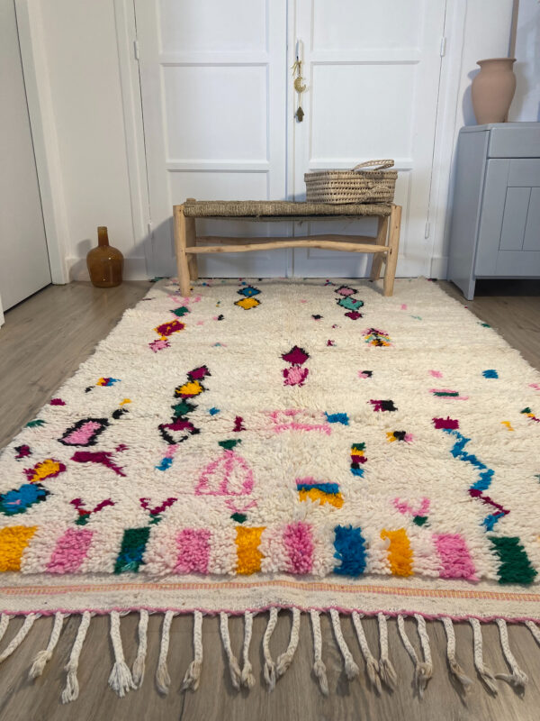 Tapis Berbère Azilal écru et formes multicolores, laine tissée à la main par nos artisans marocains.