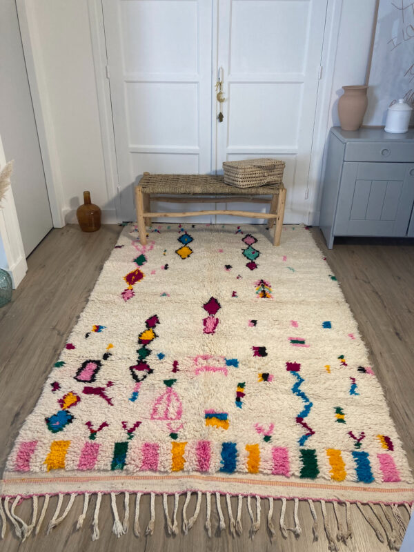Ce tapis berbère coloré a nécessité de nombreux jours de travail à la main, selon un procédé ancestral et authentique propre aux tisseuses Berbères.
